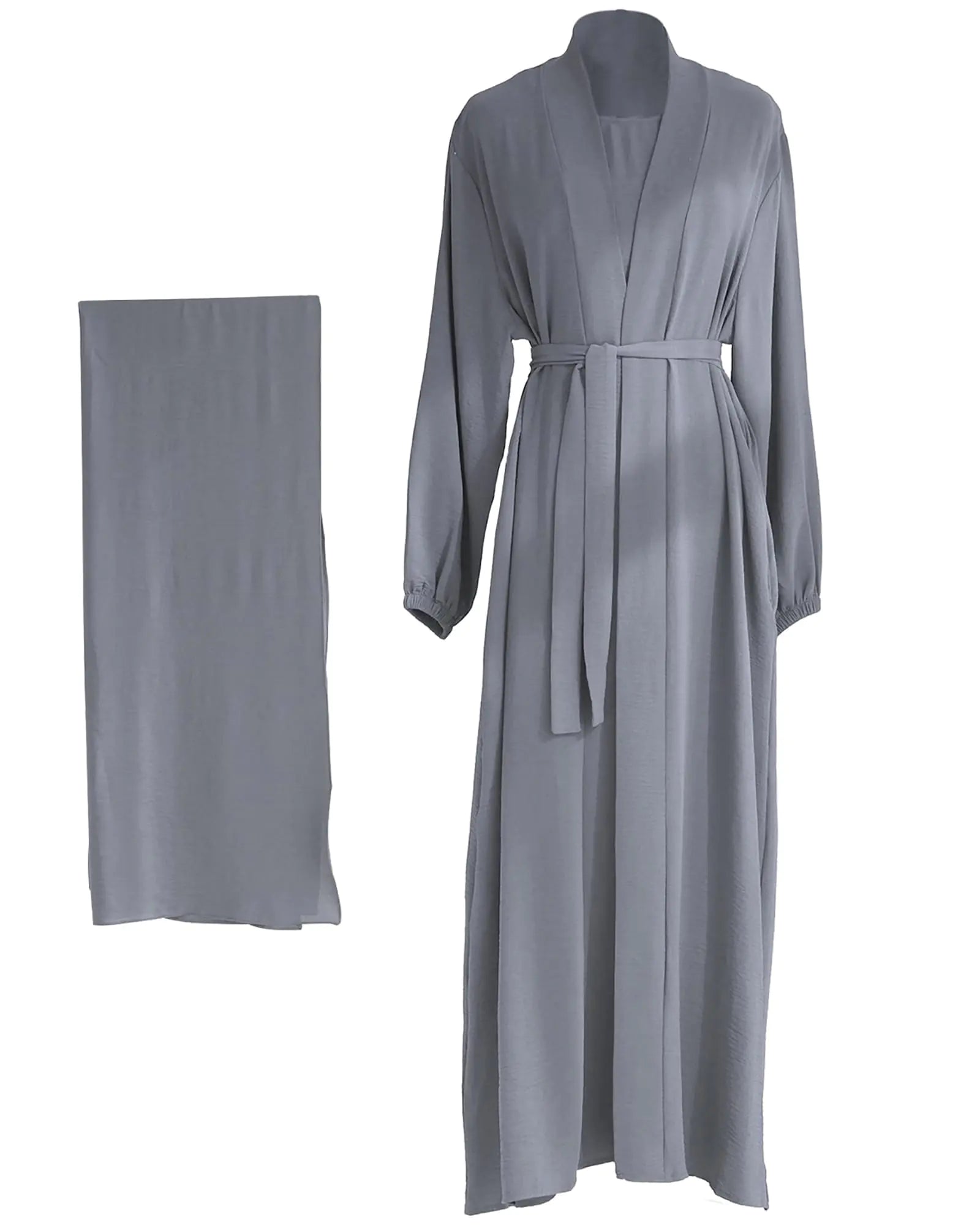 Feature: Celebrate modesty with style! The set includes a dress, cardigan, and belts, featuring a sleek, solid color design and a round neck for an elegant silhouette. The inner dress is sleeveless, tailored to respect traditional Muslim values.