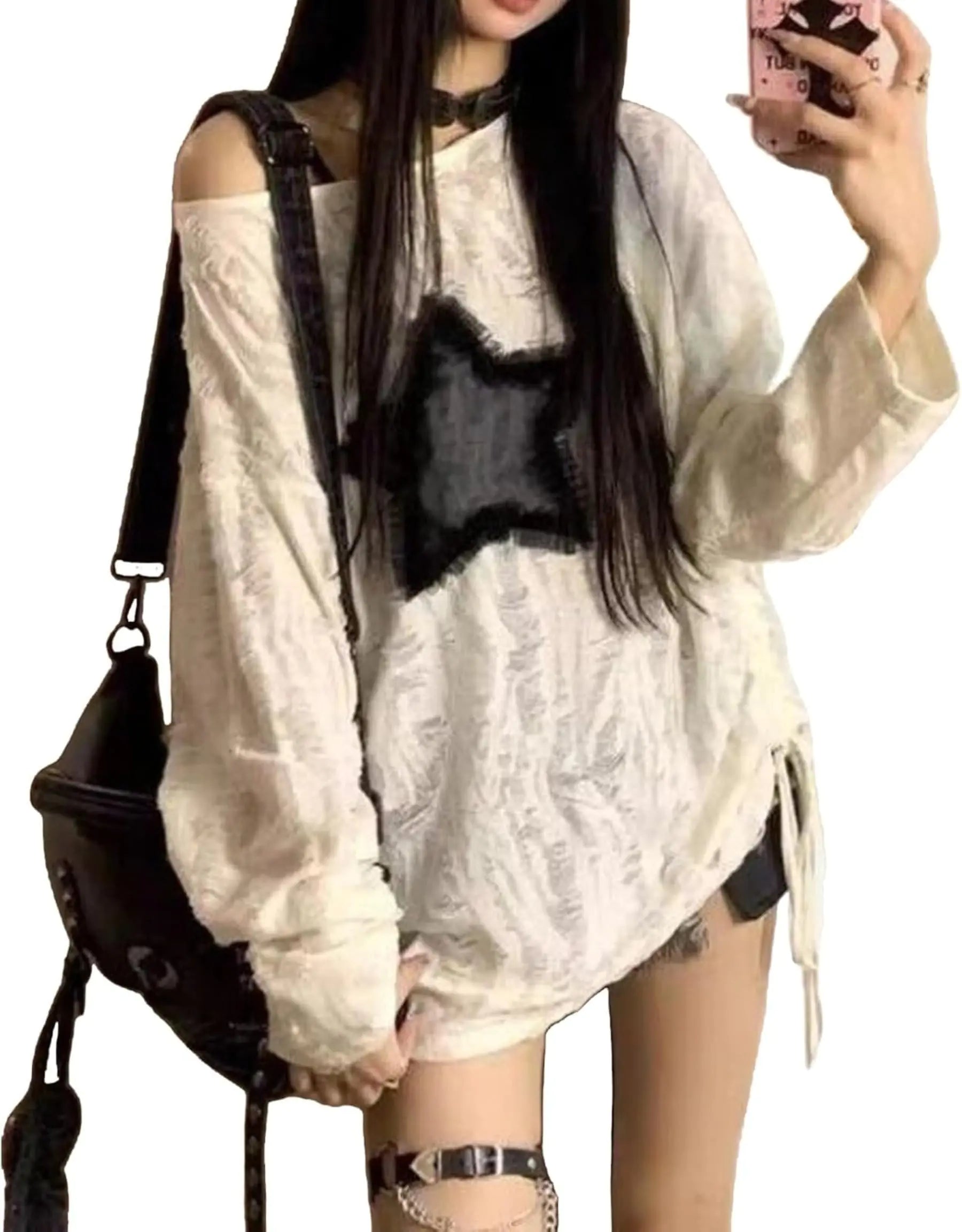 QHD Star Top Y2k Tops Emo Tops Grunge Clothes Goth Clothes Vintage Clothes Off Shoulder Top Long Sleeve Top (WhiteMedium)